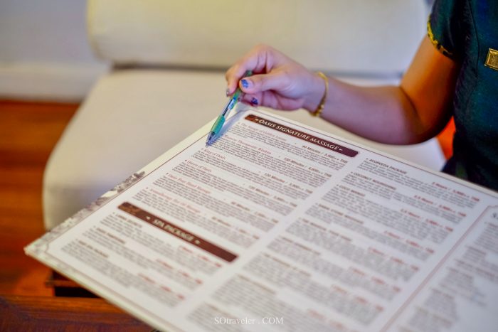 จากนั้น spa consultant เดินเข้ามากล่าวต้อนรับ และเสริฟน้ำขิง พร้อมผ้าเย็นไว้ให้ผู้มาเยือนได้คลายไอร้อน พร้อมกล่าวแนะนำเมนูพักผ่อนที่หลากหลายเพื่อให้เหมาะสมกับ lifestyle ของผู้ใช้บริการ