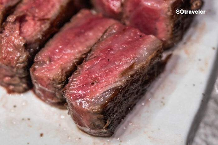 และเมื่อถึงคิวของ Sendai Wagyu Sirloin A4 ความสนใจทั้งหมดบนเรือลำนี้เหมือนถูกรวบไว้เป็นหนึ่งเดียว เชฟย่างเนื้อให้เกิด Crust บางกรอบสีทองงดงาม ก่อนตัดเป็นชิ้นขนาดพอดีคำ ไขมันระดับ A4 เคลือบริมฝีปากและลิ้นอย่างละมุน โดยให้สัมผัสที่บาลานซ์กว่า A5 ซึ่งมักมีไขมันสูงกว่า ทิ้งกลิ่นควันไว้เพียงแผ่วเบา เนื้อสัมผัสนุ่มฉ่ำจนแทบละลายหลังเคี้ยวเพียงไม่กี่ครั้ง เป็นอีกหนึ่งจังหวะที่ทั้งภาพ เสียง และกลิ่นรวมตัวกันอย่างสวยงาม เปรียบเสมือนคลื่นลูกใหญ่ที่ซัดเข้ามาอย่างนุ่มนวลในค่ำคืนนี้