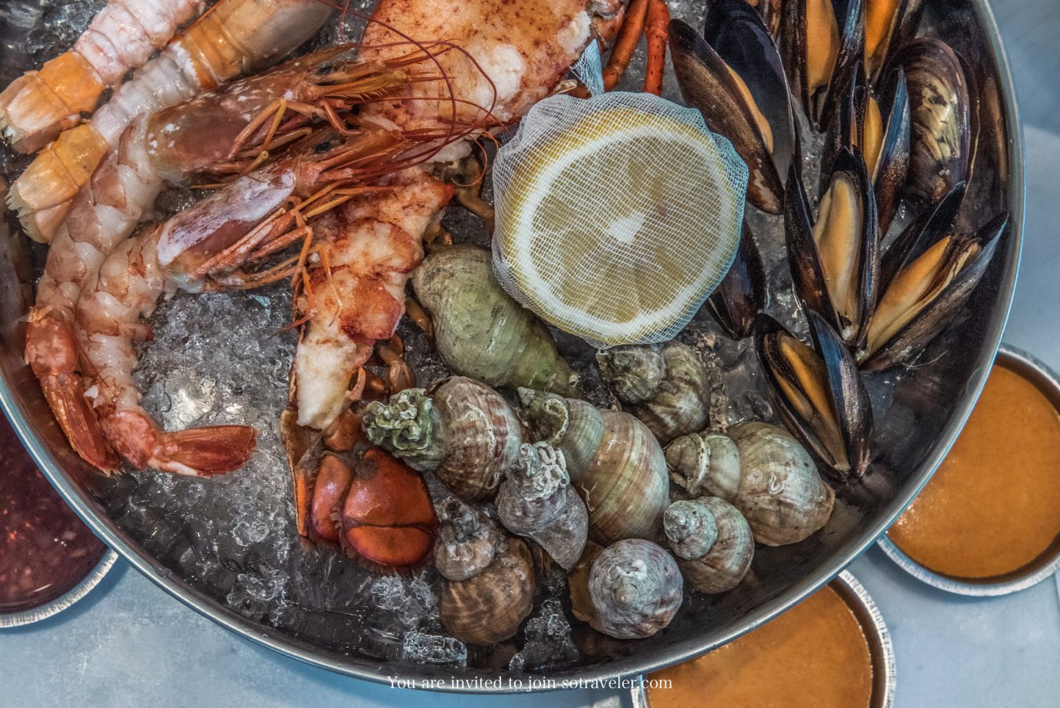 ทางร้านมีแพลตเตอร์รวมเมนูหอยและกุ้งให้เลือกสั่งด้วย จะเริ่มต้นสั่งที่เมนูแพลตเตอร์ก็เป็นไอเดียที่ดีไม่เบา เพราะแพลตเตอร์จะมีหอยนางรมรวมอยู่ในรายการ หากสั่งแพลตเตอร์แล้วติดใจเมนูไหนเป็นพิเศษก็สามารถสั่งเพิ่มได้ อย่างวันนี้เรามา 2 คน ก็สั่งมาเป็น Shellfish Platter (THB 1,990) ที่ประกอบไปด้วย 4 Oysters, Mussels, 2 Red Prawns, 2 Langoustines, Seasonal Mussels, Normandy Whelks, Half Lobster หรือ Half Cornish Crab และ Ceviche Scallop เสิร์ฟมาพร้อมกับค็อกเทลซอส ที่ให้รสชาติหวานมันเผ็ด เข้ากันได้ดีกับเมนูต่างๆในแพลตเตอร์