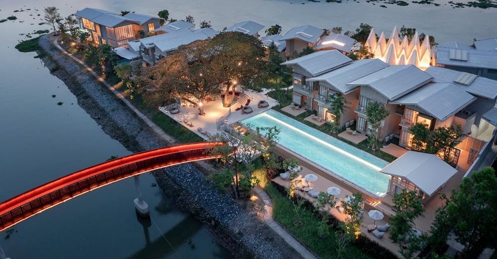 ศาลาบางปะอิน บูติกรีสอร์ทหนึ่งเดียวที่ตั้งอยู่บนเกาะส่วนตัวกลางแม่น้ำเจ้าพระยา จังหวัดพระนครศรีอยุธยา ใกล้พระราชวังบางปะอิน สถานที่ที่มีประวัติศาสตร์ยาวนานกว่า 390 ปี โดยมีห้องพักและพูลวิลล่ารวม 24 ห้อง ออกแบบภายใต้แนวคิด “Historical Getaway” นำภูมิทัศน์ชนบทของอยุธยามาผสานเข้ากับการดีไซน์ร่วมสมัย สร้างสรรค์จากวัสดุท้องถิ่นต่างๆ อย่างผ้าโปร่ง อิฐ ไม้ธรรมชาติ และงานจักสาน มอบบรรยากาศที่เรียบง่าย ผ่อนคลาย และเป็นกันเอง โดยตัวอาคารได้รับการออกแบบให้มีขนาดสอดคล้องกับบ้านเรือนโดยรอบ โอบล้อมด้วยต้นไม้เขียวขจี และต้นจามจุรีสูงใหญ่ที่ได้รับการอนุรักษ์ไว้เป็นอย่างดี ควบคู่กับการมอบความสะดวกสบายและฟังก์ชันการใช้งานที่ทันสมัยครบครัน แขกที่มาเยือนจะได้รับการต้อนรับบริเวณพื้นที่ล็อบบี้ที่โปร่งสบาย แต่งแต้มด้วยสีแดงอันสดใส ใต้อาคารไม้ยกพื้นสูง พร้อมด้วยแลนด์มาร์กสำคัญที่กลายเป็นสัญลักษณ์ประจำบูติกรีสอร์ทแห่งนี้ คือสะพานสีแดงทอดข้ามแม่น้ำ ที่มีสีสันโดดเด่น แต่ก็กลมกลืนไปกับบริบทของหมู่บ้าน ทำหน้าที่เชื่อมพื้นที่สองฝั่ง และแฝงถึงการเชื่อมโยงระหว่างสถาปัตยกรรมสมัยใหม่กับวิถีชุมชนท้องถิ่นริมฝั่งน้ำได้เป็นอย่างดี