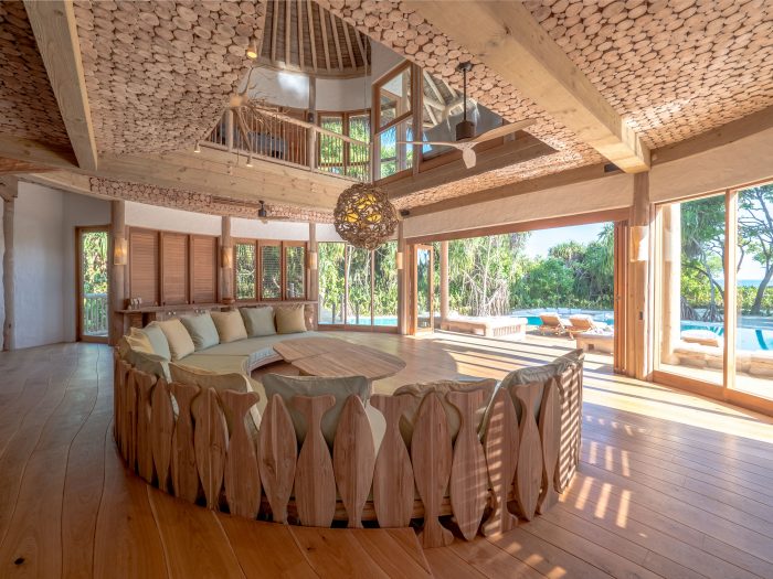 พื้นที่สำหรับรับประทานอาหาร, ครัว และห้องนั่งเล่น เปิดโล่ง ภายใต้เพดานสูงโปร่ง มีหน้าต่างหลายบานเพื่อรับแสงธรรมชาติได้อย่างเต็มที่ พื้นที่สันทนาการโอ่โถงกว้างขวางเหมาะอย่างยิ่งสำหรับการสังสรรค์ภายในครอบครัว เสาทุกต้นของห้องนี้ออกแบบเก๋ไก๋โดยใช้ไม้ทั้งต้นแต่วางโดยให้ส่วนฐานอยู่ด้านบน เสมือนมีรากแผ่ยึดบนเพดาน ซึ่งบริเวณเพดานทั้งหมดยังถูกตกแต่งด้วยท่อนไม้หลากหลายขนาด ส่วนบาร์อาหารเช้าจะตั้งอยู่ระหว่างครัวเปิด และโต๊ะรับประทานขนาด 10 ที่นั่ง ห้องครัวมาพร้อมกับตู้แช่ไวน์รวมถึงมินิบาร์ และตู้เก็บอาหาร ภายใต้แสงจากหลอดไฟที่ติดบนรากของต้นไม้ห้อยจากบนเพดาน และสามารถเอนกายพักผ่อนที่ห้องนั่งเล่น ซึ่งเป็นเดย์เบดรูปทรงโค้ง ขนาดใหญ่ ขาและพนักพิงทำจากแผ่นไม้รูปปลา