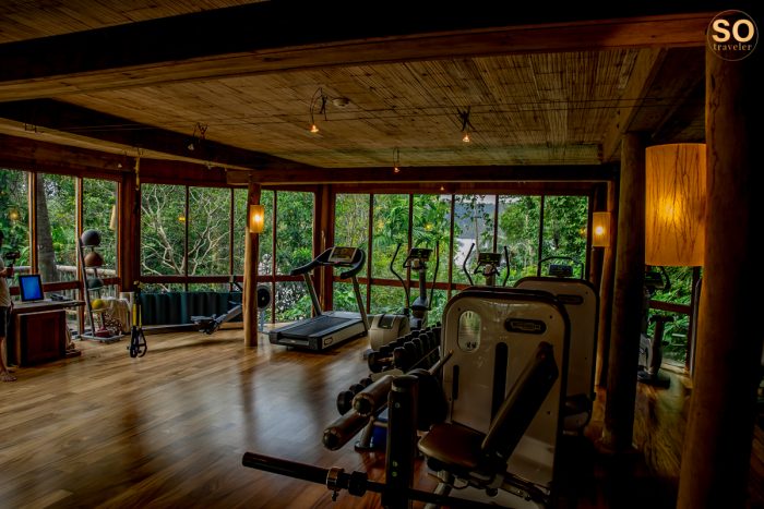 วิลล่าหลังใหญ่บางหลังจะมีฟิตเนสส่วนตัวอยู่ในบ้าน ดังนั้นห้องฟิตเนสจะไม่มีใครมาใช้งานกันจริงจังมาก แวะเวียนมาออกกำลังกายช่วงเวลาสั้นๆ แล้วเน้นการทำกิจกรรมอื่นๆ ภายในรีสอร์ท เห็นบรรยากาศของฟิตเนสท่ามกลางธรรมชาติแบบนี้ มันก็อยากลองเล่นกันสักหน่อยแหล่ะน่า