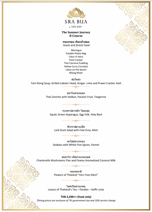 เซตดินเนอร์ “The Summer Journey” เกิดจากความร่วมมือกันระหว่างเชฟมิชลินสตาร์ “เฮนริค อูล แอนเดอร์เซน” เชฟที่ปรึกษากิตติมศักดิ์ของห้องอาหารสระบัว บาย กิน กิน และหัวหน้าพ่อครัว “ชยวีร์ สุจริตจันทร์” ที่นำเอาวัตถุดิบท้องถิ่นประจำฤดูกาลมาสร้างสรรค์เป็นอาหารไทยสไตล์โมเดิร์นสุดครีเอทีฟจำนวน 8 คอร์ส เริ่มด้วยอภินันทนาการอาหารกรุบกรอบสไตล์ snacks and street-food เพื่อเป็นการเรียกน้ำย่อยก่อนที่ทุกท่านจะเริ่มรับประทานอาหารในเมนูแรก เช่น ขนมกรอบไข่ขาวซอสถั่วเหลืองพร้อมมายองเนสวาซาบิ (Meringue soya wasabi) ที่มาพร้อมกับเม็ดมะม่วงหิมพานต์ในถุงพลาสติกใส (edible plastic bags of nuts) ต่อด้วยเมนูแคบหมูน้ำพริกหนุ่ม ไอศกรีมโคนแกงเหลือง และทูน่าทาร์ทาร์เสิร์ฟในดอกบัว เป็นต้น