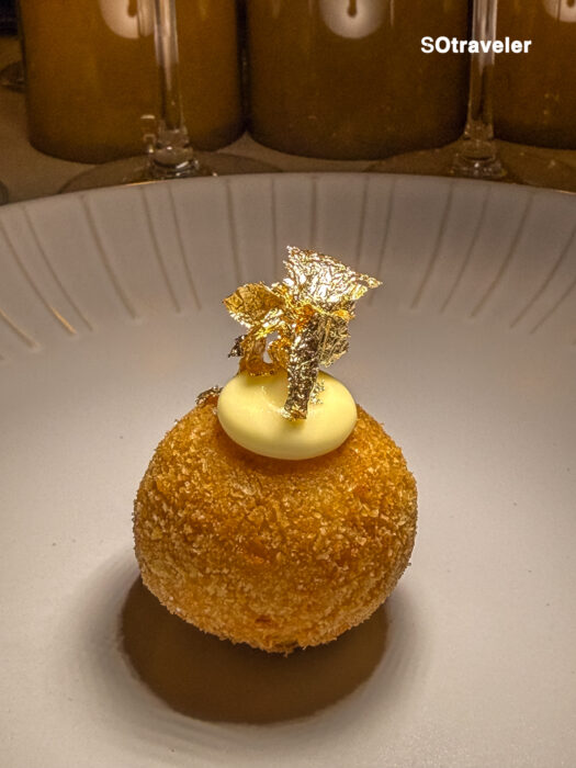 เมื่อยามค่ำคล้อยเข้ามาใกล้เรื่อยๆ แสงสีทองของพระอาทิตย์สุดท้ายสะท้อนลงบนแก้วไวน์และจานเรียงรายบนโต๊ะ มื้อค่ำของเราที่ Stella เริ่มต้นด้วย Amuse Bouche จานเล็กแต่เปี่ยมด้วยรสชาติ “Frittata di Maccheroni” พาสต้าที่นำมารวมกับเนื้อปูสดหวานละมุน ราดเลมอนมายองเนสให้กลิ่นหอมสดชื่น
