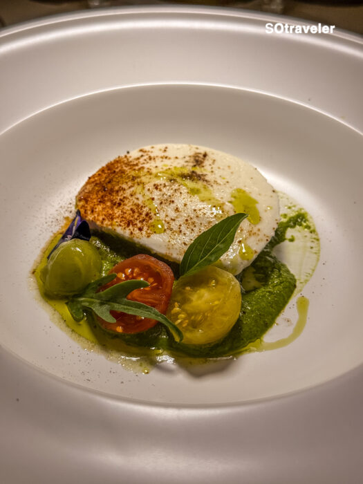 เมนูแรกอย่าง Caprese Stella คือการตีความใหม่ของสลัดคาเปรเซ่ในแบบร่วมสมัย มะเขือเทศตามฤดูกาลที่มีทั้งความฉ่ำและเปรี้ยวหวานพอดี วางคู่กับชีสมอซซาเรลล่าเนื้อเนียนนุ่ม ราดด้วยร็อกเก็ตเพียวเร่ที่เพิ่มรสขมอ่อน ๆ และกลิ่นสมุนไพรแบบอิตาเลียนแท้ เป็นจานที่ให้ความรู้สึกสดใสเหมือนฤดูร้อนบนเกาะคาปรี