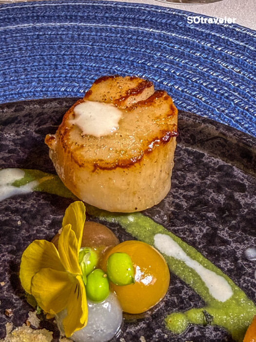 ต่อด้วย Capesante e Pisseli หอยเชลล์ย่างจนสุกกำลังดี ผิวด้านนอกหอมกลิ่นทะเลแต่ด้านในยังคงนุ่มฉ่ำ เสิร์ฟบนพิวเร่ถั่วลันเตาเนียนละเอียด โรยเกล็ดขนมปังกรอบผสมสมุนไพรให้รสสัมผัสหลากหลาย
