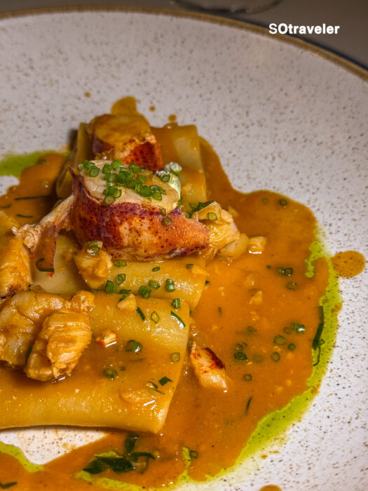 ปิดท้ายจานเรียกน้ำย่อยด้วย Paccheri Lobster เส้นพัคเครีขนาดใหญ่เคล้าด้วยซุปล็อบสเตอร์บิสค์เข้มข้น ท็อปด้วยล็อบสเตอร์เนื้อแน่นและต้นหอมซอยละเอียด ทุกองค์ประกอบอยู่ในสมดุลที่พอดี ทั้งความมัน ความเค็ม และความหวานจากเนื้อทะเลที่สดใหม่