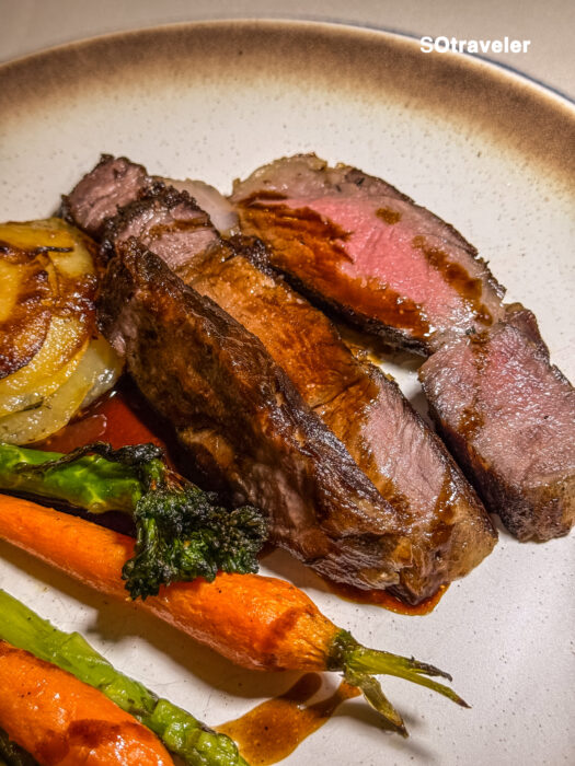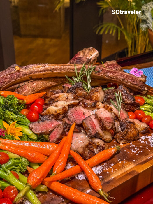 ค่ำคืนนี้เราได้ลองจานหลักที่เชฟตั้งใจนำเสนอ Dry-Aged Heritage Wagyu Tomahawk เนื้อวากิวที่ผ่านการดรายเอจจนได้กลิ่นและรสเข้มข้น ย่างจนได้เปลือกกรอบบาง ๆ ข้างในยังคงชุ่มฉ่ำ เสิร์ฟคู่หน่อไม้ฝรั่ง บร็อกโคลินี และมันฝรั่ง Anna ที่เรียงซ้อนอย่างประณีต ราดด้วยซอสเนื้อเข้มข้นที่เพิ่มมิติให้กับรสชาติ เนื้อทุกคำละลายในปาก พร้อมกลิ่นหอมที่ค่อย ๆ แผ่วปลายอย่างนุ่มนวล