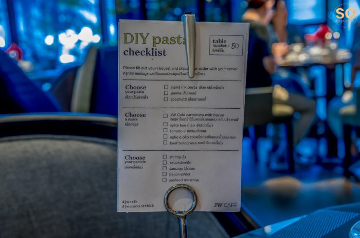 บนโต๊ะมีกระดาษให้เลือกสั่งพาสต้าที่ชื่นชอบ ในรูปแบบของ DIY Pasta นำไปยื่นให้ที่สเตชั่นหรือฝากพนักงาน สักครู่ก็จะมีพาสต้ามาเสิร์ฟถึงโต๊ะ มีหลายแบบหลายรสชาติ พาสต้าเลิฟเวอร์ต้องมา