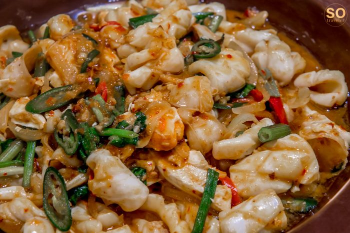 เมนูที่เราได้ชิมวันนั้นคือ “ขนมจีนน้ำยาใส่ไก่ฉีกและหมูหยอง”