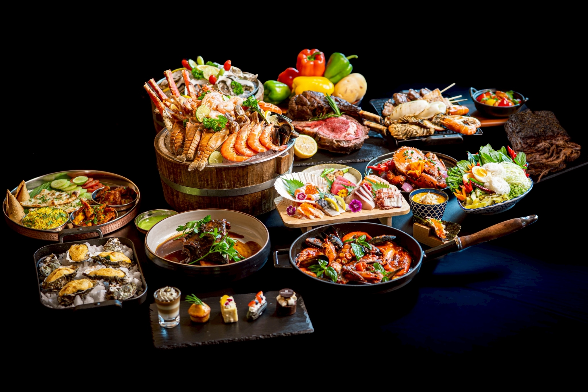 เริ่มต้นด้วยซีฟู้ดออนไอซ์สุดอลังการ ไม่ว่าจะเป็นปูอลาสก้าคิงแครบ กุ้งแม่น้ำ ล็อบสเตอร์ กั้ง และหอยนานาชนิด ทั้ง หอยนางรมฟินเดอแคลร์ (Fine de Claire) หอยนางรมนอร์มังดี (Normandy) และหอยนางรมเกาหลี พร้อมด้วยสเตชั่นอาหารญี่ปุ่นสดใหม่ ที่เสิร์ฟซูชิและซาชิมิเกรดพรีเมียม ทั้งแซลมอน ทูน่า ฮามาจิ และวากิว นิกิริ เพลิดเพลินกับมุมเนื้ออบและกริลล์แบบสดใหม่ ที่นำเสนอเนื้อพรีเมียมอย่าง เนื้อไพร์มริบออสเตรเลีย เนื้อวากิวบริสเก็ต รมควันสไตล์เท็กซัส ขาแกะอบ แซลมอนนอร์เวย์ และหอยเชลล์อเมริกาย่างเสิร์ฟร้อน นอกจากนี้ยังมีมุม BBQ ปิ้งย่างสดใหม่ ทั้งกุ้งแม่น้ำ หมึก เนื้อวัว และซี่โครงแกะ หลากหลายเมนูเด่น นานาชาติ ที่มาเติมเต็มความอร่อย ทั้งซุปล็อบสเตอร์บิสก์ หอยนางรมร็อคกีเฟลเลอร์ (Oysters Rockefeller) ปูผัดซอสพริกสไตล์สิงคโปร์ มัสมั่นแก้มวัว และก๋วยเตี๋ยวเนื้อวากิวรสเข้มข้น