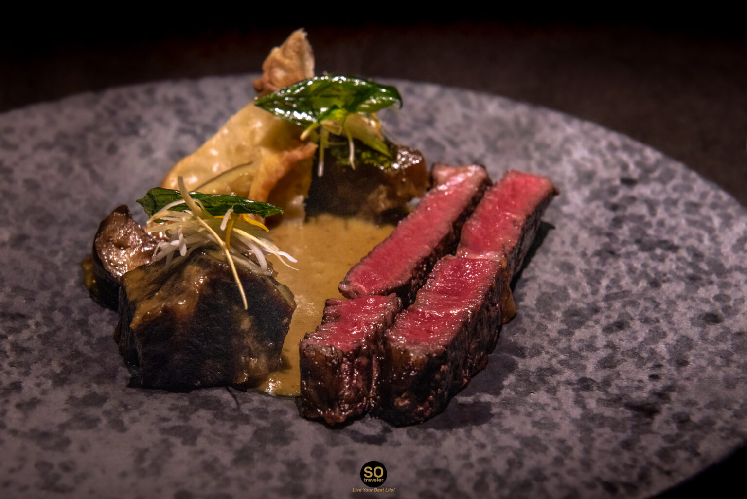 คอร์สที่สิบเอ็ด แกงระแวงเนื้อ เนื้อริบอายซึ่งเป็นเนื้อส่วนที่นุ่มและถ่ายทอดรสชาติของเนื้อได้อย่างเข้มข้น ย่างในระดับความสุขมีเดียมแรร์เสิร์ฟคู่กับแก้มวัวรมควันตุ๋น ราดด้วยซอสแกงระแวง แกงไทยโบราณที่มีลักษณะเป็นแกงกะทิคล้ายพะแนงแต่ใช้พริกแกงแบบแกงเขียวหวานและมีการเติมขมิ้นสดและตะไคร้ รสชาติเผ็ดร้อน เค็มนำหวานตาม น้ำขลุกขลิก หอมเครื่องสมุนไพร เข้ากันได้ดีมากกับริบอายที่สุกกำลังดีและแก้มวัวตุ๋น