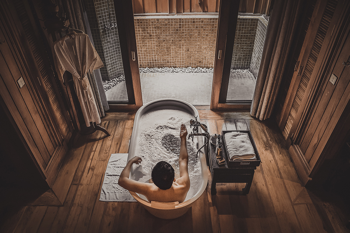 ไฮไลท์ของวิลล่าหลังที่ 8 นี้คือ การมีอ่างอาบน้ำอยู่กลางห้อง สามารถแช่น้ำอย่างผ่อนคลายอยู่ในอ่างอาบน้ำที่อุ่นๆสบายๆ พร้อมกับเปิดม่านเพื่อชื่นชมท้องฟ้าไปพร้อมๆกันเนี่ย โรแมนติกน่าดู