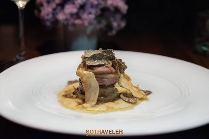 ปิดท้ายเซ็ต Appitizer ด้วยเมนูที่มีกลิ่นหอมเรียกความสนใจตั้งแต่นำมาเสิร์ฟคือ Millefoglie di filetto di vitello cotto a bassa temperatura, foie gras e mela glassata, riduzione al Calvados, tartufo nero (750++ บาท) เนื้อสันในลูกวัวอบ มาพร้อมกับสัมผัสที่นุ่ม ฉ่ำ และฟัวกราส์ จัดวางเรียงซ้อนกันแบบ ‘มีล์เฟย (Millefoglie)’ ตัดรสด้วยแอปเปิ้ลสไลด์เคลือบรสหวาน นอกจากจะมีรสชาติที่กลมกล่อมแล้วยังมีกลิ่นหอมจากคาลวาโดส และเห็ดทรัฟเฟิลดำ ใครที่ชื่นชอบความหอมของเห็ดทรัฟเฟิลก็น่าจะถูกใจเมนูนี้ทีเดียว