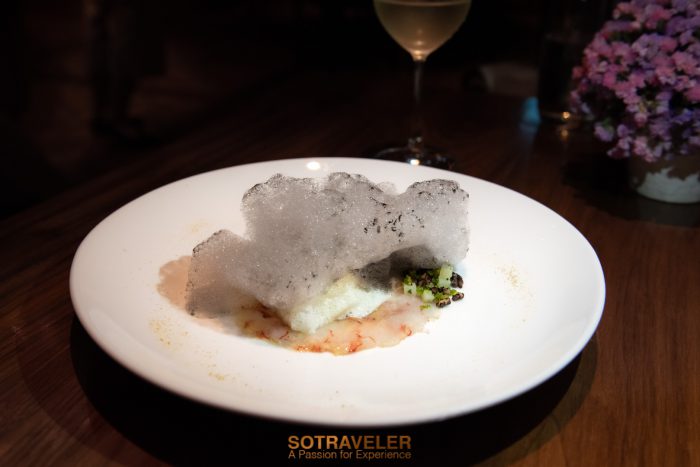 ถัดมาที่จานต่อไป Carpaccio di gamberi rossi, ostrica caramellata, emulsione di albume, spumante e olio evo, crumble di riso nero, pistacchio e patata, aria di mare (920++ บาท) จานนี้นอกจากจะมีหน้าตาที่โดดเด่นแล้ว ยังชวนให้หวนรำลึกถึงความเป็นอิตาเลียนแบบดั้งเดิมด้วย คาร์ปาชโช่ (carpaccio) หรือเนื้อสัตว์สไลด์/ทุบให้บางแล้วเสิร์ฟแบบดิบ ซึ่งเชฟทาโนได้เลือกใช้กุ้งแดง (Red prawns) เป็นวัตถุดิบหลักสำหรับจานนี้ เคียงคู่มากับหอยนางรมฟินเดอแคลร์ที่นำไป caramelized จนได้กลิ่นหอม ทานคู่กับข้าวสีนิลบด ถั่วพิสตาชีโอ และมันฝรั่ง เพิ่มความน่าสนใจด้วย Seawater air เป็นเนื้อโฟมบางเบาด้านบน