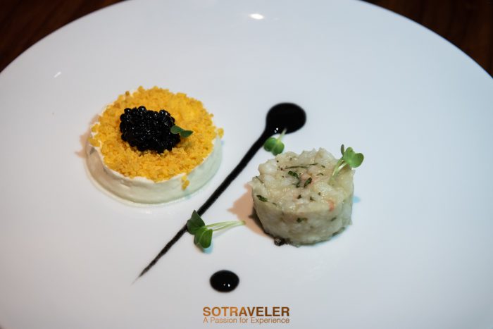 เมนูแรกคือ Morbido di robiola, albume e patata, caviale Home made, tartare di scampi, crema al nero (950++ บาท) ซึ่งเชฟทาโนเลือกเสิร์ฟเป็น 2 องค์ประกอบในจานเดียว ด้านขวาคือ กุ้งแลงกูสทิน (Langoustine) เนื้อหวานผสมกับซอสทาร์ทาร์ คลุกเคล้ากับ Robiola Cheese ชีสสัญชาติอิตาเลียนทำให้ได้รสชาติที่พอดี ส่วนด้านซ้ายคือ มันฝรั่งเนื้อเนียนนุ่มที่ด้านบนโรยด้วยคาร์เวียร์สูตรโฮมเมด เรียกได้ว่าจานนี้เป็นการนำวัตถุดิบที่มีรสชาติหลากหลายมารวมกันอย่างลงตัว ให้รสชาติที่ไม่หนักเกินไป สมกับเป็นเมนูเริ่มต้นเตรียมความพร้อมสำหรับจานต่อไปได้เป็นอย่างดี