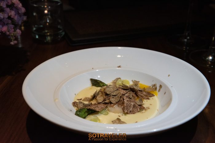 Vellutata di formaggella, uova di quaglia poché, asparagi, crumble di parmigiano e tartufo Bianco o nero (860++ บาท) เสิร์ฟมาในรูปแบบของครีมซุป ตัวเนื้อซุปมีส่วนผสมหลักจาก Formagella ทวีความหอมเย้ายวนชวนให้ลิ้มลองด้วยกลิ่นของเห็ดทรัฟเฟิลขาว และเห็ดทรัฟเฟิลดำสไลด์ เสิร์ฟพร้อมไข่นกกระทาต้ม หน่อไม้ฝรั่ง และพาร์เมซานบด รสชาตินุ่มแต่ไม่เลี่ยน สัมผัสได้ถึงความลงตัวของทุกวัตถุดิบได้อย่างน่าประทับใจ