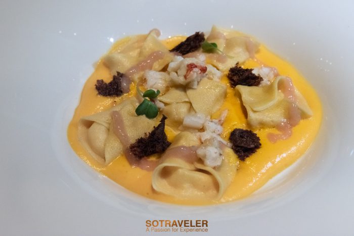 เพิ่มเติมความเป็นอิตาเลียนด้วยพาสต้า คอร์ส เมนูแรกคือ Ravioli di astice e mozzarella, spuma di carota, spugna di fave di cacao (850++ บาท) ราวีโอลี่ (Ravioli) ซึ่งเป็นสูตรโฮมเมดตามแบบฉบับของเชฟทาโน ตัวไส้ทำจากบอสตันล็อบสเตอร์ และมอซซาเรลล่า (buffalo mozzarella) ได้รสชาติชีสแบบเต็มคำ เคียงคู่มาอย่างสวยงามกับแครอทโฟม และโกโก้สปันจ์