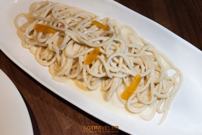 สำหรับจานต่อไปคือ Spaghetti alla chitarra in bianco (760++ บาท) สปาเก็ตตี้ที่หน้าตาดูเรียบง่าย แต่รสชาติ และวัตถุดิบนั้นไม่ธรรมดา จานนี้ถือว่าเป็นไฮไลท์ของเชฟทาโน โดยเชฟทำเส้นขึ้นมาเองเป็น chitarra เส้นยาวที่สอดไส้ครีมไว้ตรงกลาง เข้ากันได้ดีกับตัวซอสที่ทำจากพาร์เมซาน