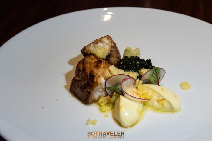 เมนูจานหลักที่เชฟทาโนเลือกเสิร์ฟในวันนั้น เมนูแรกคือ Cernia con spinaci al peperoncino , crema di zafferano (1750++ บาท) ปลาเก๋าที่เสิร์ฟคู่กับผักโขมผัดพอสุกในสไตล์ sautéed ทานแล้วสัมผัสได้ถึงรสที่จัดจ้านมากขึ้นกว่าจานที่ผ่าน ๆ มา แถมยังได้กลิ่นหอมจากหญ้าฝรั่น (saffron) เครื่องเทศที่ได้ชื่อว่ามีราคาแพงที่สุดมาใส่ลงในจาน สมกับเป็นเมนูจากเชฟระดับมิชลินสตาร์จริง ๆ