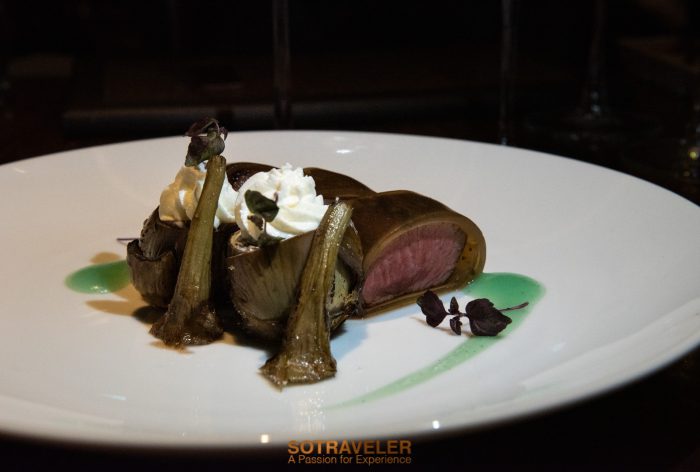 ปิดท้ายเซ็ตจานหลักได้อย่างสมบูรณ์แบบด้วย Carrè d’agnello cotto a bassa temperatura fasciato del suo fondo, miele e menta gel. carciofo caramellato con mousse di ricotta al limone e menta (1800++ บาท) เชฟทาโนเลือกนำเนื้อแกะส่วนติดกระดูก (lamb rack) ไปซูวีเพื่อทำให้สุก แต่ยังคงไว้ซึ่งความชุ่มฉ่ำ เพิ่มรสชาติความหวานนุ่มลิ้นด้วยน้ำผึ้ง เสิร์ฟพร้อมอาร์ติโชค (artichoke) รสหวานมัน ทานคู่กับมูสชีสที่เจือด้วยกลิ่นมินต์ และเลมอนจาง ๆ