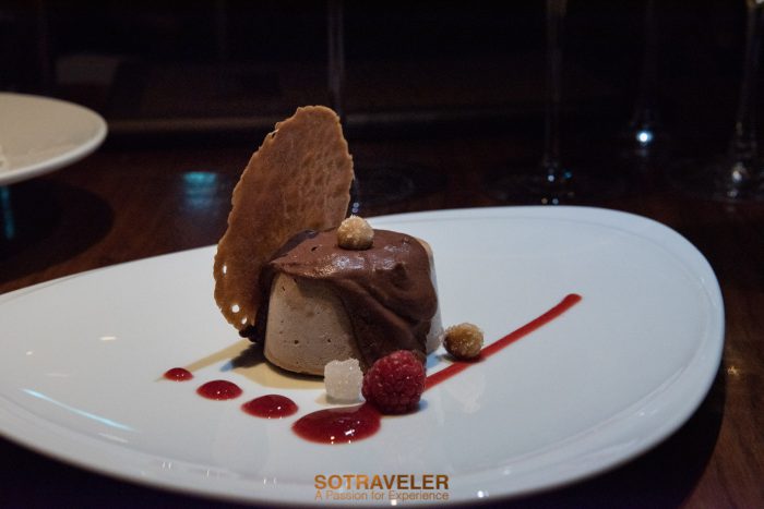 เมนูของหวานเบา ๆ ตบท้ายในสไตล์อิตาเลียนคือ Bavarese di nocciola, ganache di cioccolato all’acqua e olio evo, nocciole sabbiate, lingua di gatto alla nocciola (350++ บาท) มูสที่ทำจากพีดมอนต์ เฮเซลนัท (Piedmont Hazelnut) เนื้อเนียนหอม ราดด้วยดาร์คช็อคโกแลตกานาชรสเข้ม ไม่หวานเกินไป