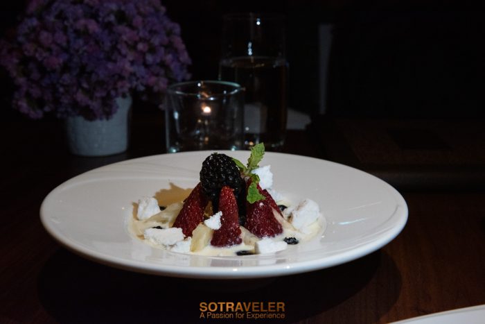 ลิ้มรสหวานซ่อนเปรี้ยวจาก Meringata scomposta in crema inglese al limone e frutti di bosco (350++ บาท) เมอแรงก์ที่เสิร์ฟพร้อมครีมเลมอน ให้รสที่เปรี้ยวหวานกำลังดี เพิ่มความสดชื่นให้กับจานนี้ด้วยเบอร์รี่สดชิ้นพอดีคำ เข้ากันได้ดีกับตัวเมอแรงก์ และครีมเลมอน รสชาติสมบูรณ์แบบส่งท้ายค่ำคืนนี้ได้อย่างน่าประทับใจ