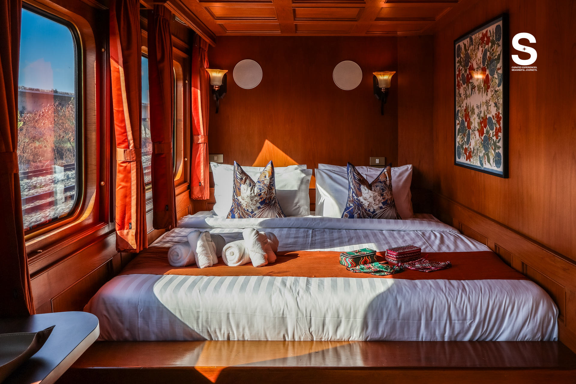 ภายในรถไฟจึงถูกตกแต่งด้วยไอเทมจาก Jim Thompson มากกว่า 2,000 ชิ้น ตั้งแต่ผ้าม่าน ปลอกหมอน ผ้าคาดเตียง ไปจนถึงผ้าปูโต๊ะและของใช้บนโต๊ะอาหาร ลวดลายส่วนใหญ่ได้แรงบันดาลใจจากธรรมชาติและเทคนิคการทอผ้าแบบดั้งเดิม ทำให้บรรยากาศบนขบวนรถไฟไม่ได้รู้สึกเหมือนพื้นที่จัดแสดง แต่เหมือนบ้านที่แฝงงานหัตถศิลป์ไทยอยู่ในทุกมุม