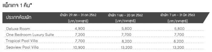 - จองแพ็กเกจ 2 คืนนี้ ห้องแบบพูลวิลล่าสำหรับเข้าพักระหว่าง 1-30 กันยายน 2562 เท่านั้น