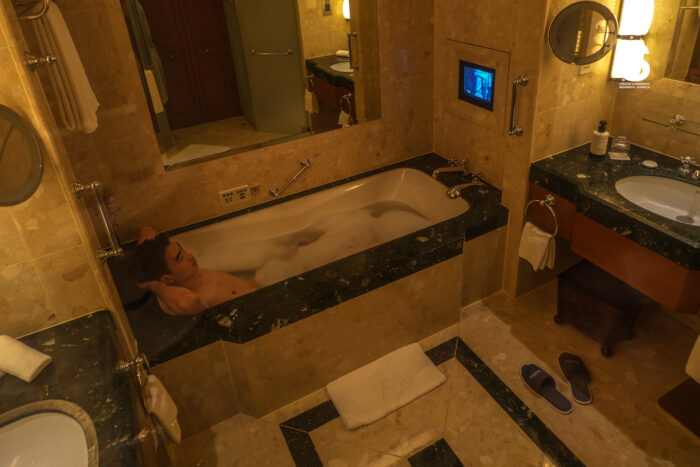 Ultimate Recovery: ห้องน้ำแบบ Double-vanity พร้อม Rain Shower และส่วนแต่งตัว (Walk-in Closet) ที่กว้างขวาง ถูกออกแบบมาเพื่อการผ่อนคลายกล้ามเนื้อและการเตรียมตัวสำหรับมื้อค่ำสุดพิเศษอย่างลื่นไหล