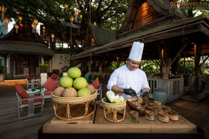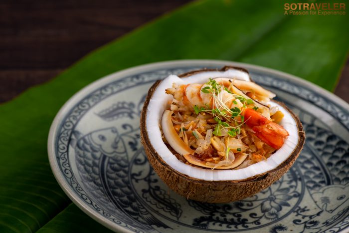 ยำด้วยส้มโอออร์แกนิกเนื้อฉ่ำหวาน อันเลื่องชื่อจาก “นครชัยศรี” จังหวัดนครปฐม คลุกเคล้ากับเครื่องยำชั้นดี ถั่วลิสง กุ้งแห้ง ใบมะกรูด และกุ้งแม่น้ำสดเนื้อแน่นตัวโต เผาเพื่อเพิ่มความหอม รสชาติเปรี้ยวหวานเค็มกลมกล่อมกำลังพอดี จัดเสิร์ฟภายในลูกมะพร้าวที่ลนไฟจนส่งกลิ่นหอม เติมเต็มความสมบูรณ์แบบของเมนูนี้ได้เป็นอย่างดี