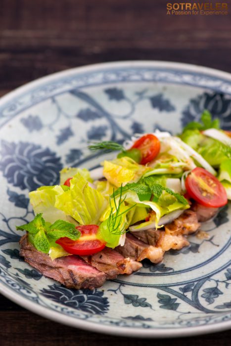 ทางห้องอาหารได้คัดสรรเนื้อสันนอกวากิวชั้นดีที่สด สะอาด และปลอดภัย เพื่อให้เมนูนี้ได้รสชาติที่ดีที่สุด และมีความอร่อยจากวัตถุดิบจริง ๆ นำมาย่างสุกในระดับมีเดียมแรร์ที่เนื้อกำลังนุ่มชุ่มลิ้น ราดด้วยน้ำยำที่ให้รสชาติเปรี้ยวหวาน หอมกลิ่นพริกสด กระเทียม และมะนาวสด คลุกเคล้ากับผักเครื่องยำอย่างมะเขือเทศ ผักกาดหอม และใบสะระแหน่