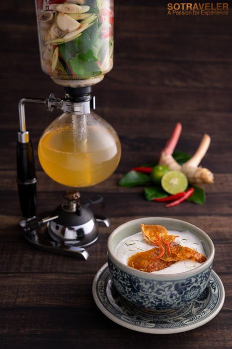 เนื้อไก่ดำที่มีคุณค่าทางโภชนาการสูง ตุ๋นจนเนื้อไก่เปื่อย ฉีกเป็นชิ้นพอดีคำให้ทานง่าย เสิร์ฟด้วยการต้มน้ำซุปกับเครื่องสมุนไพรต้มข่า พริก ข่า ตะไคร้ ใบมะกรูด เพิ่มความหอมให้ยั่วน้ำลายมากยิ่งขึ้นด้วยการบีบน้ำมะนาวสดใส่ลงไป เสิร์ฟในชามที่ราดด้านบนด้วยฟองครีมกะทิ เพิ่มความกรุบกรอบด้วยหนังไก่ทอด รสชาติกลมกล่อม หอม มัน