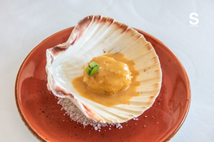 Scallop in Bread Crumb, Coral Sauce หอยเชลล์ย่างมาแบบพอดี ไม่สุกเกิน เนื้อยังฉ่ำและนุ่ม ด้านนอกเคลือบด้วยเกล็ดขนมปังบาง ๆ เพิ่มเท็กซ์เจอร์ กรุบเบา ๆ ตัดกับซอสคอรัลที่ให้รสเข้มและกลิ่นทะเลชัด Snow Fish, Romesco Sauce ปลาหิมะ เนื้อขาวนุ่ม ละเอียด และฉ่ำ เสิร์ฟคู่ซอส Romesco ที่ให้รสเข้มจากพริกและถั่วแบบสเปน ช่วยดึงรสของปลาให้เด่นขึ้น โดยไม่กลบรสธรรมชาติ