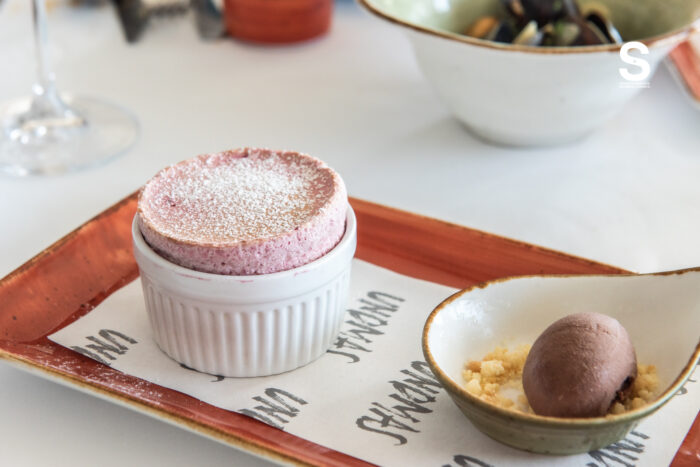 Soft Catalan Cream with Caramel Ice Cream คาตาลันครีมเนื้อนุ่ม กลิ่นวานิลลาและซิตรัสอ่อน ๆ เสิร์ฟคู่ไอศกรีมคาราเมลที่ช่วยเพิ่มความเย็นและความหวาน Raspberry Soufflé with Chocolate Ice Cream ซูเฟล่ราสป์เบอร์รีเนื้อเบา ฟู และมีความเปรี้ยวสดใส เสิร์ฟคู่ไอศกรีมช็อกโกแลตที่ช่วยเพิ่มความเข้ม