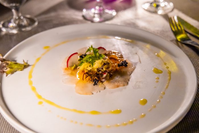 เริ่มต้นกันที่แอพพิไทเซอร์อย่างแรก คาร์ปาชิโอ้ ล็อปสเตอร์ ครีม คาเวียร์ (Carpaccio Lobster Cream Caviar)