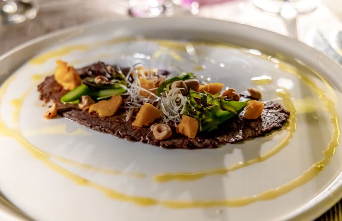 ซูก้าร์ เคิร์ล ออสเตรเลียน บีฟ รัมพ์ (Sugar Cured Australian Beef Rump) สะโพกวัวออสเตรเลียสไลซ์ ทานคู่กับหน่อไม้ฝรั่ง เชดด้าชีสคิ้วบ์ (Aged Cheddar) ราดด้วยซอสเฮลเซนัท