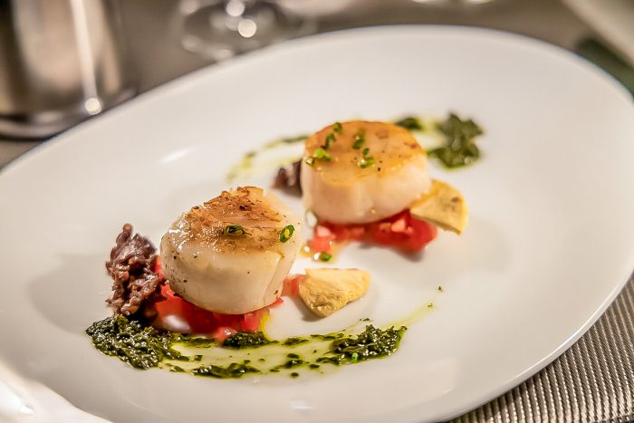 ฮอกไกโด สแกลล็อป (Hokkaido Scallop) สแกลลอปจากฮอกไกโดไซส์ XL ราดด้วยซอสทะบูล่า ทานคู่กับบลัดซอสเซจ (Blood Sausage) และพริกเผา