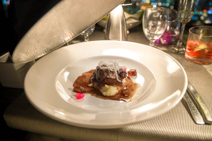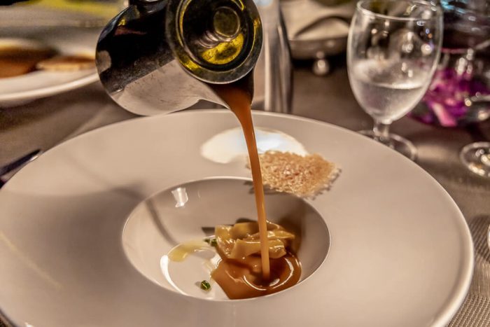 สำหรับเมนคอร์สจานนี้ ตอนแรกยังแอบคิดว่า มันจะคุ้มค่าหรอที่นำเนื้อวากิวชอร์ทริปส์มาตุ๋น เพราะกลัวจะเสียจุดเด่นของมันไป แต่กลับไม่เลย เพราะเป็นเนื้อวากิวตุ๋นที่นุ่มละมุนมาก ๆ ละลายไปในปาก ยิ่งได้ทานคู่กับมันบดเนื้อเนียนแล้วด้วย จานนี้ถือว่าเป็นอาหารรสเลิศที่เราแทบไม่ต้องเคี้ยวเลย