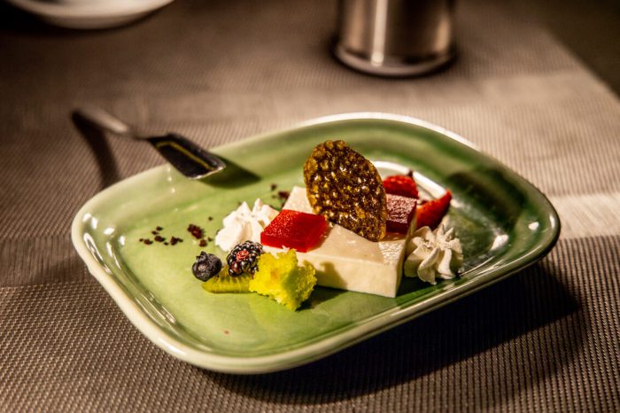 ปิดท้ายด้วยขนมหวานของคอร์สอย่างพานาคอตต้าที่ทำจากชีสมาสคาโปเน่(แช่เย็น) ให้เนื้อสัมผัสที่เนียน และไม่เหลวจนเกินไป เนื้อแน่นกำลังดี ทานคู่กับเบอร์รี่และผลไม้ต่างๆ ทำให้ได้รสชาติหวานมัน ตัดกับหวานอมเปรี้ยวได้กำลังดีสุดๆ