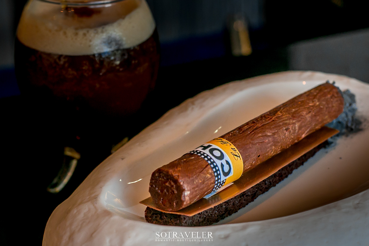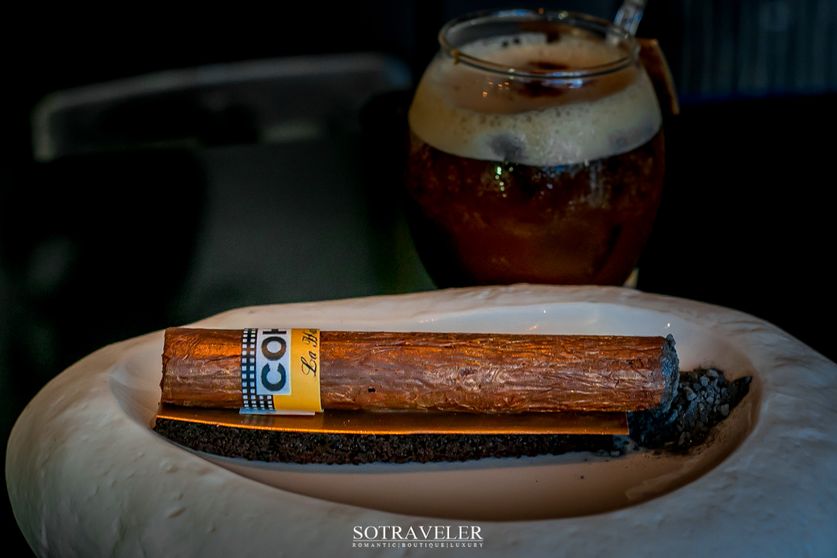 เมนูซิกเนเจอร์ที่ฟาบิโอ บรูโนลาโร (Fabio Brugnolaro) เลือกมิกซ์ให้เราชิมเป็นแก้วแรกในวันนี้คือ มิสเตอร์บราวน์กับซิการ์โคฮิบาของเค้า (Mr.Brown and his Cohiba Cigar) ชื่อภาษาไทยนี้เราตั้งเอง ถ้าไปที่ร้านก็เรียกหามิสเตอร์บราวน์อย่างเดียวก็เป็นอันรู้กัน ฟังแล้วน่ารักน่าชังคล้องจองกับหมีบราวน์ตัวการ์ตูนของไลน์ เป็นเมนูคู่แมชชิ่งกันระหว่างค็อกเทลกับของหวาน (Cocktail & Dessert) ที่ต้องทานคู่กันถึงจะลงตัวที่สุด