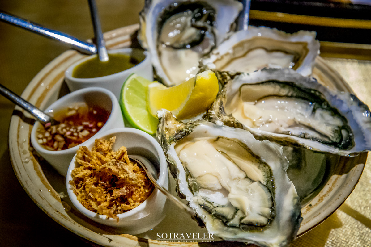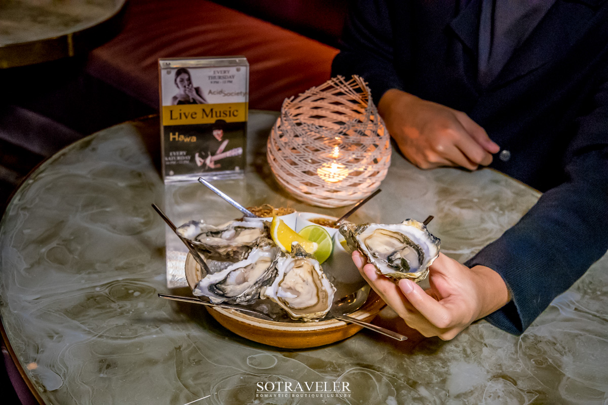 หอยนางรมฝรั่งเศสฟิน เดอ แคลร์ เสิร์ฟพร้อมกับเครื่องเคียง (Fine de claire oyster with condiments) ฟิน เดอ แคลร์เนื้อบางแต่ตัวใหญ่เต็มฝา มีความฉ่ำ รสชาติกลมกล่อมทานง่าย เสิร์ฟมาพร้อมกับเครื่องเคียงปรุงรสอย่างน้ำส้มสายชูหมักเรดวิเนก้า หอมแดงเจียว น้ำจิ้มซีฟู้ด และเลม่อนสไลซ์ เมนูนี้สั่งมาเป็นสตาร์ทเตอร์ถือเป็นการเรียงลำดับได้ดีสำหรับการเรียกน้ำย่อย