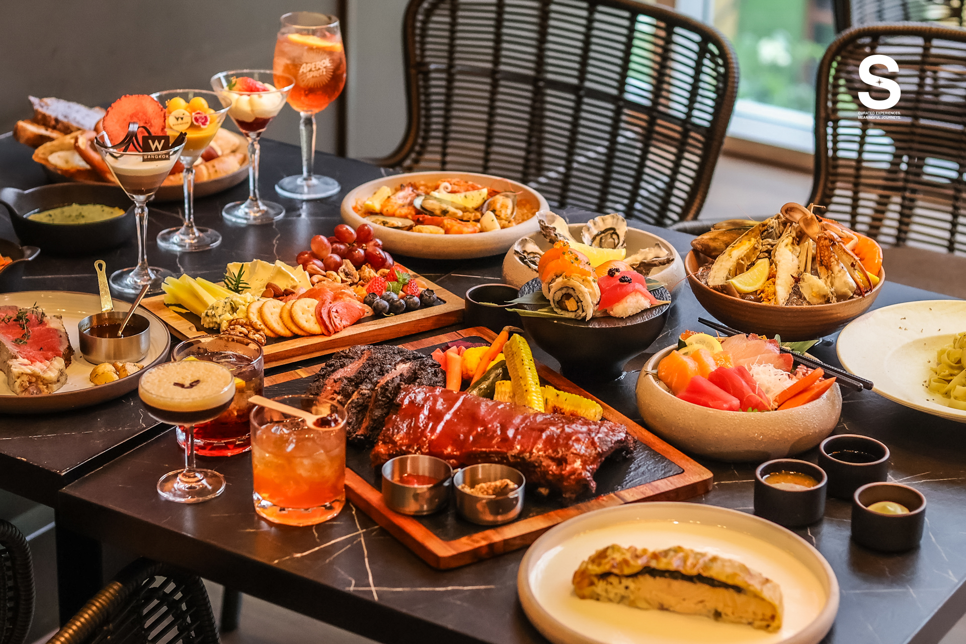 ก่อนจบมื้อยังมี Desserts & Sweet Indulgence ที่รวมขนมหวานหลายชนิดให้เลือกทาน ปิดท้ายพร้อมเครื่องดื่มจากบาร์ของบรันช์ ซึ่งมีค็อกเทลให้เลือกหลากหลาย ทั้งสูตรคลาสสิกและสูตรที่สร้างสรรค์ขึ้นใหม่ เช่น Espresso Martini, Bloody Mary, Americano และ Boba Punch ที่นำชาไทยมาปรับเป็นค็อกเทลในสไตล์ร่วมสมัย